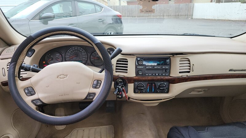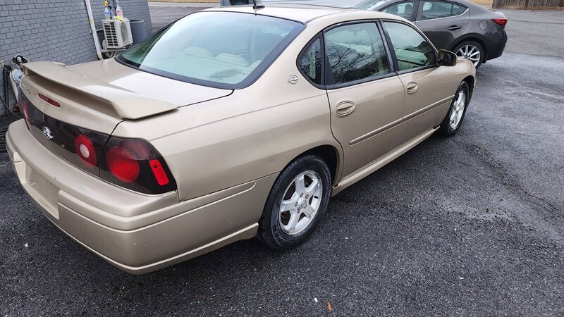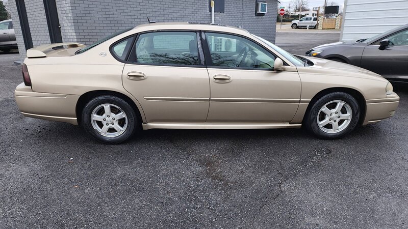 2005 Chevrolet Impala LS in Sandstone Metallic with a Neutral cloth interior, powered by a 3.8L V6 (200 hp, 225 lb-ft) paired with a 4-speed automatic and front-wheel drive. Factory equipment includes air conditioning, cruise control, tilt steering, power windows and door locks with remote keyless entry, power mirrors, AM/FM stereo with CD player, 60/40 split-folding rear seat, cloth upholstery, rear window defogger and standard safety features such as dual front airbags and child seat anchors. Vehicle has excellent mileage — under 126,000 miles.